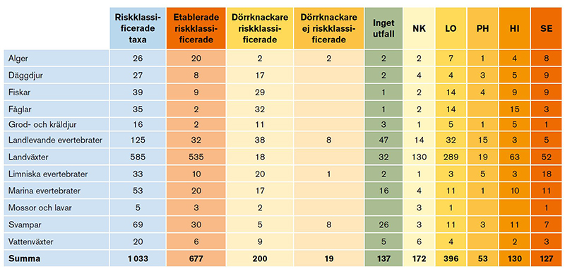 SLU Artdatabanken genomförde under perioden mars–augusti 2017 en översiktlig genomgång av främmande arter med utgångspunkt i IUCN:s metodik ”EICAT”: Environmental Impact Classification for Alien Taxa. Uppdragets startpunkt var en lista med drygt 5 000 arter som myndigheterna ställt samman utifrån tidigare existerande artlistor. Arterna har, utifrån kriterierna i ovan angiven metod, sorterats. De arter som behövt fördjupad granskning av biologin för att möjliggöra uppskattning av vilken risk de utgör för inhemsk biologisk mångfald har riskklassificeras i arbetet under 2017-2018. Vissa arter har fallit bort - och några har tillkommit.