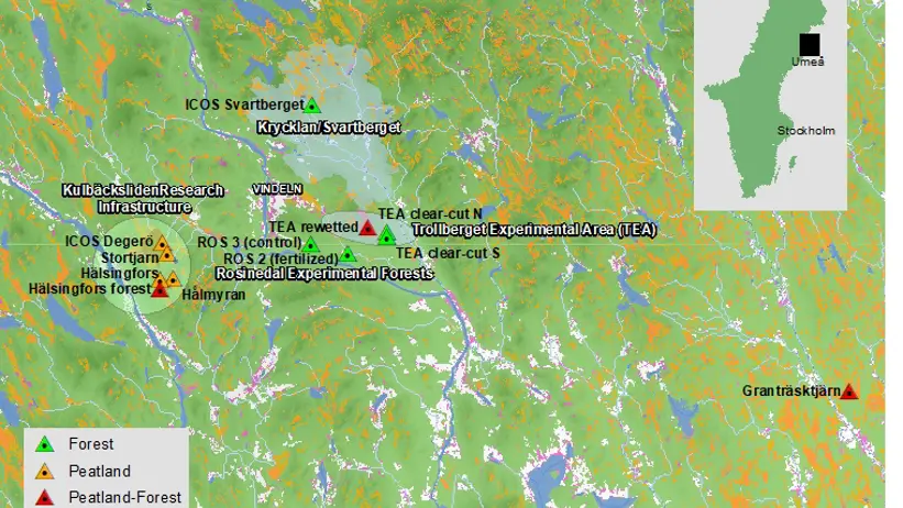 The boreal biome is an important component of the global carbon (C) cycle and therefore a key element in national and international policy frameworks for climate change mitigation. However, current estimates of its sink-source strength and its responses to management and climate change remain uncertain. Thus, we need to improve our understanding of biosphere-atmosphere exchanges of C and GHGs for which comprehensive empirical data are required across multiple spatio-temporal scales. We obtain these data through a comprehensive network of flux- and environmental monitoring stations (read more under Infrastructure).