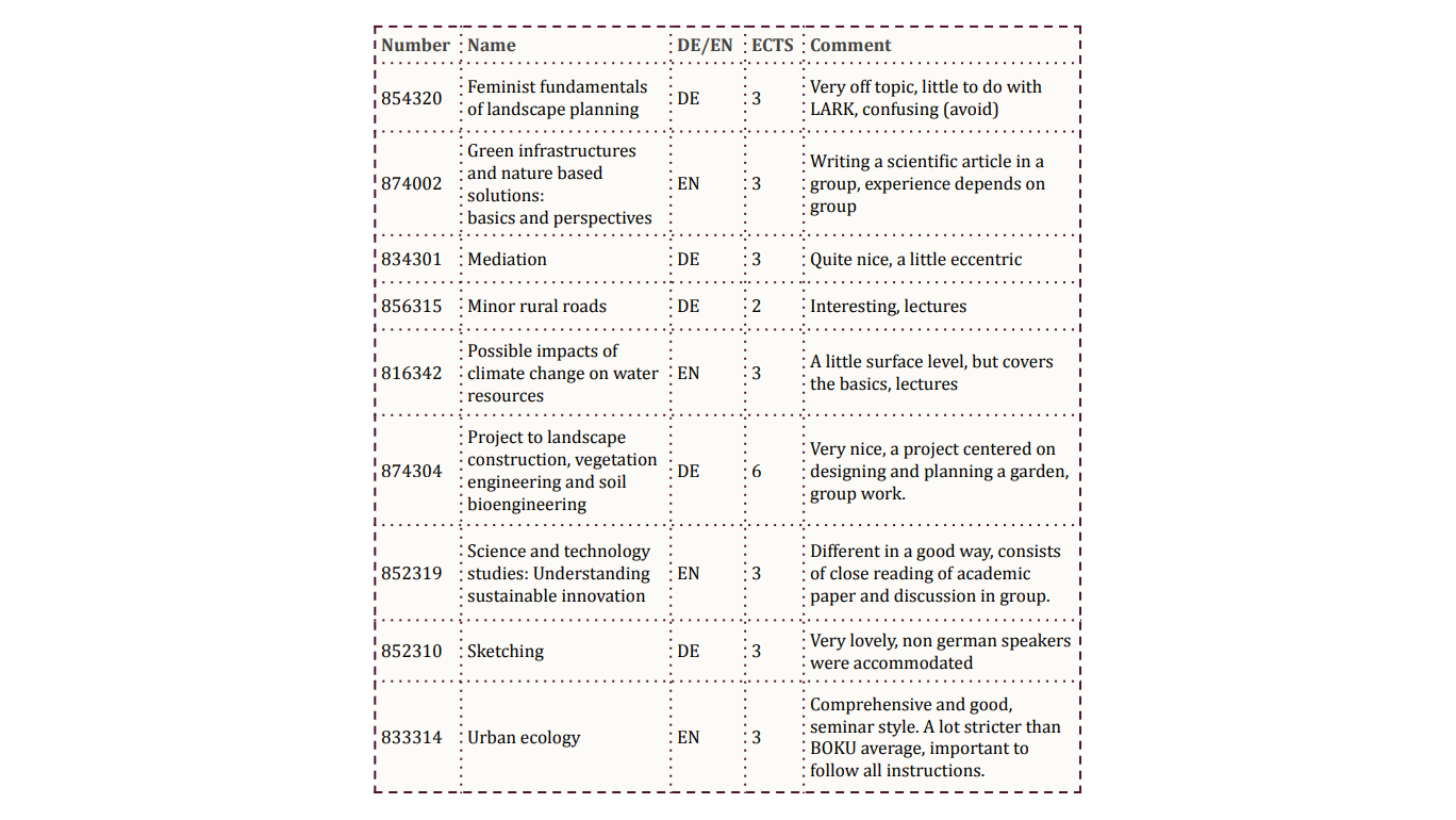 below. Specifically at BOKU it is going to take a lot of time to select your courses, and it might be hard to get exactly 30 ECTS, so if it is possible for you to arrange it so that you don't need precisely 30, that will save you some stress. If a course you want to take is already full, a friendly email to the professor where you explain your situation will most likely solve that. There will also be overlap of schedule between the different courses, this is normal and okay if it's not too often.