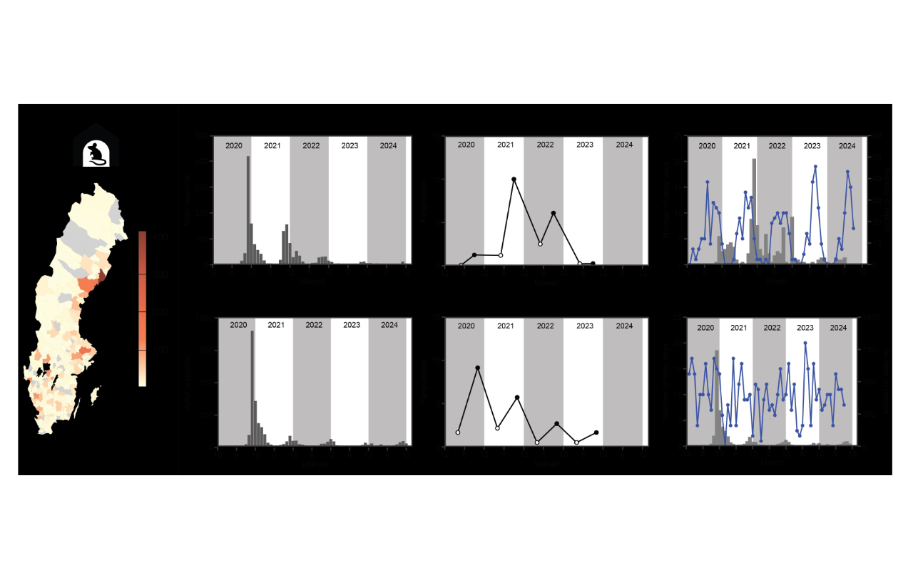 Det stora antalet sorkar som observerades inomhus under vintern 2020/21 följdes åt av en topp i antalet människor som insjuknade i sorkfeber (incidens = antal diagnosticerade fall per 100 000 invånare). Det stora antalet observationer av sorkar inomhus föregicks i sin tur av en regnig höst. Det är därför rimligt att anta att det är regniga förhållanden under senhösten – då det också är matbrist i sorkarnas naturliga miljöer – som driver sorkarna inomhus. Våra analyser indikerar därför att kombinationen av regn på senhösten och ett stort antal gnagare i naturliga miljöer ökar risken för utbrott av sorkfeber.