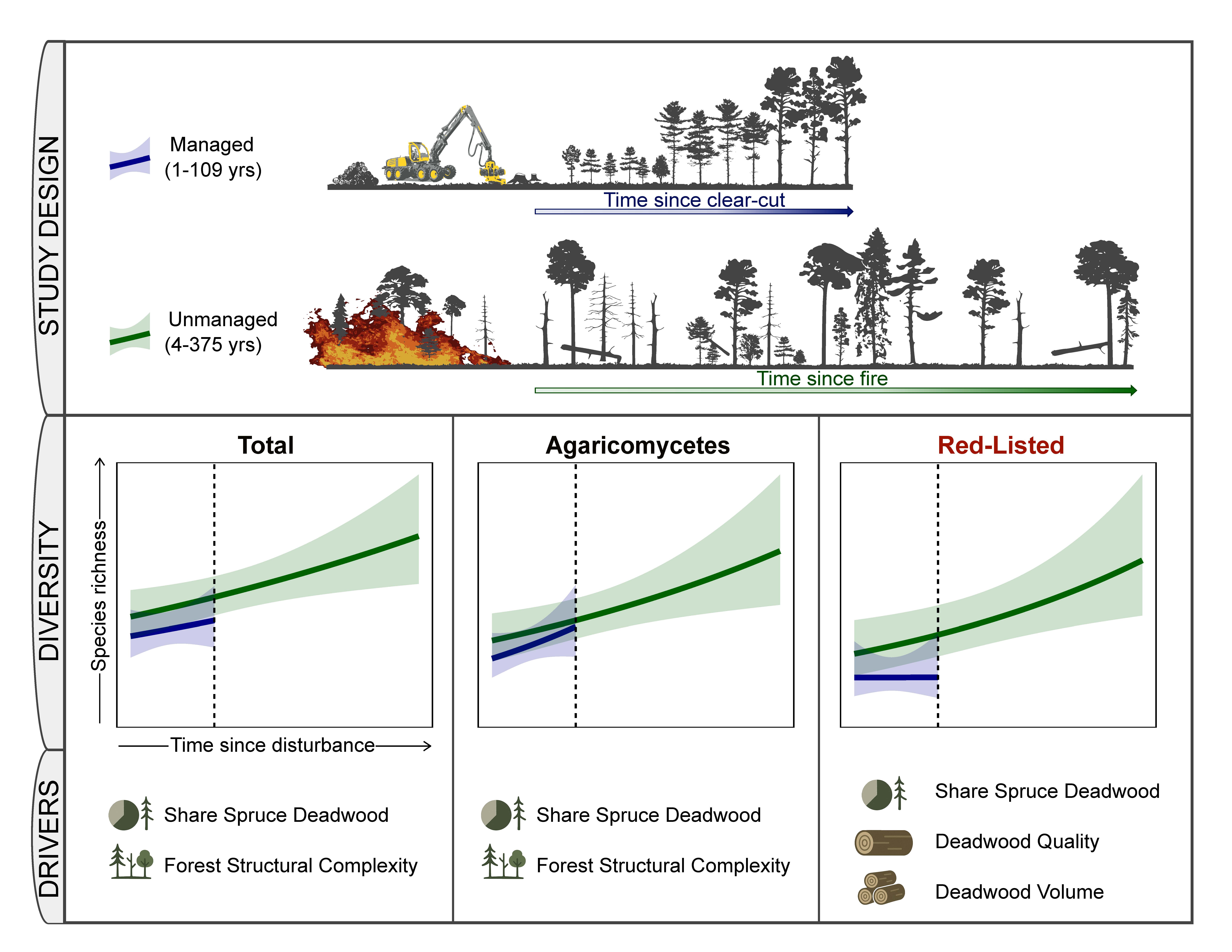 Distinct diversity trajectories of boreal wood-inhabiting fungi following fire versus clear-cutting (British Journal of Ecology, 2026)