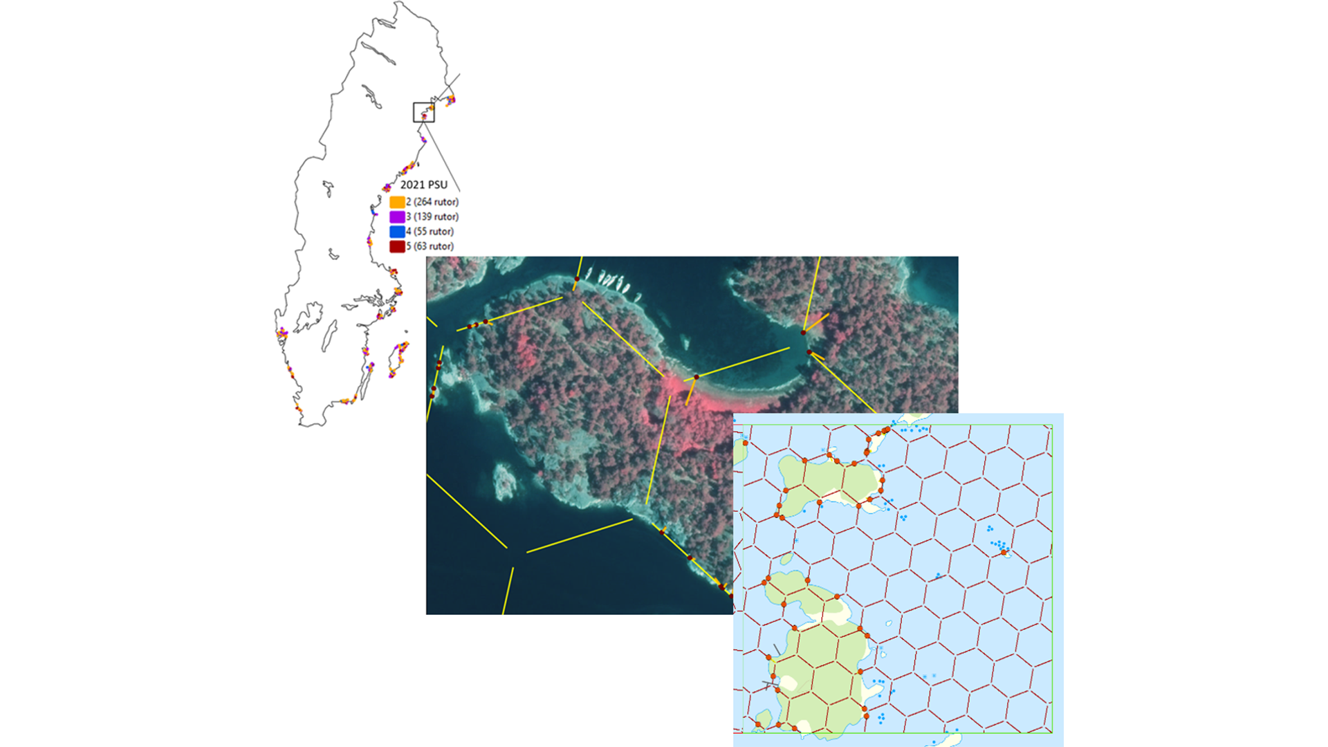 Bild 3. Utlägg av transekter. Där en strecken på sextanten korsar strandlinje läggs en transekt ut för att sedan tolkas och bedömmas vara ett potentialt habitat eller inte.