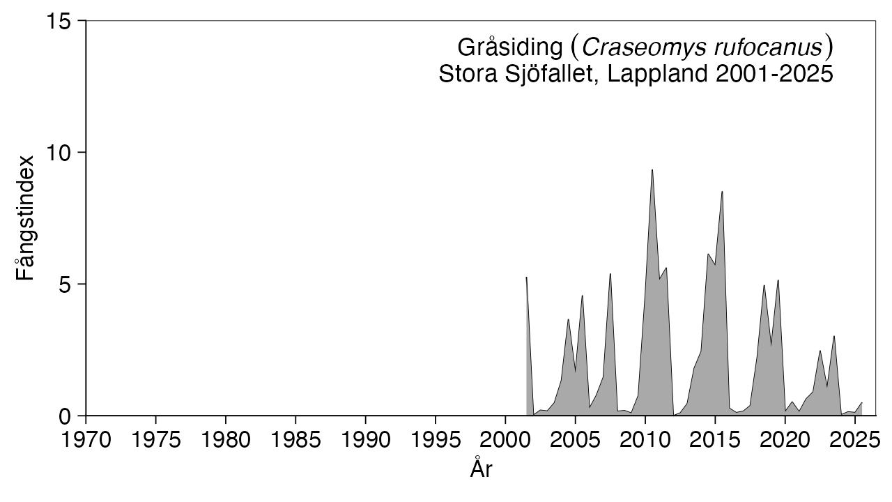 Med tanke på att fångstindex för såväl gråsiding, åkersork som fjällämmel var av ungefär samma eller större storleksordning som i Ammarnäs och att dessutom rödsork och mellansork visade relativt höga fångstindex, kan man karaktärisera 2001 som ett toppår för sork och lämmel även i Stora Sjöfallet.